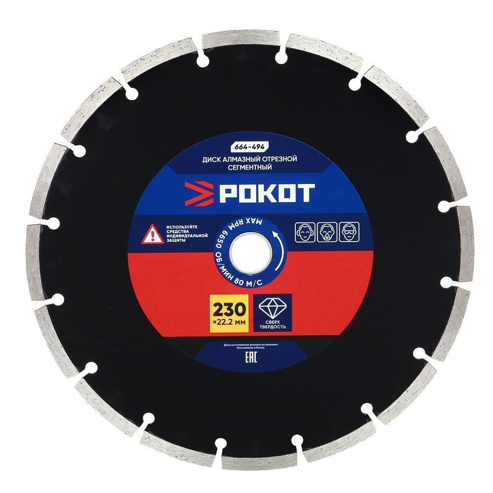 Отрезной алмазный диск РОКОТ сегментный 230х22,2 мм предназначен для сухой и мокрой резки армированного бетона, кирпича и керамики. Используется в качестве насадки для угловой шлифовальной машинки с максимальным числом оборотов в 6650 об/мин при максимальной скорости 80 м/с. Также совместим с ручным электрическим плиткорезом и штроборезом. Алмазные сегменты отличаются сверхтвердостью, обеспечивая четкий и ровный рез. Корпус из 65 стали обладает высокой прочностью и износостойкостью. Имеет посадочное отверстие с переходным кольцом диметром 22/20 мм. Процесс резки сопровождается воздушным охлаждением.